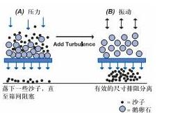 (B)振动筛网,破坏位于混合物底部的积聚鹅卵石层,使完全分离得以进行;切向流过滤中,进科流的错流动力学作用,就相当于此例中的振动。